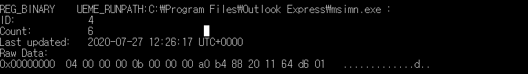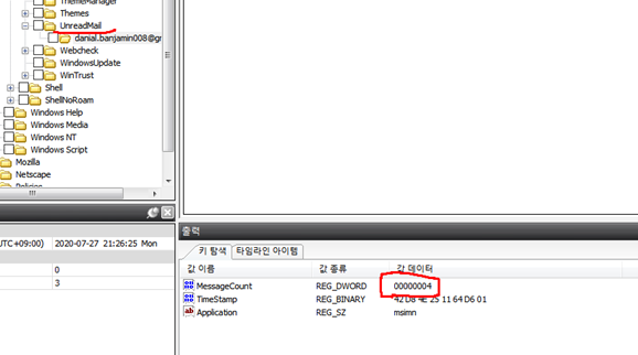volatility에서 printkey 플러그인을 사용하여 printkey -o 0xe1aa5b60 -K "Software\Microsoft\Windows\CurrentVersion\UnreadMail\" 로 확인할 수도 있다.
