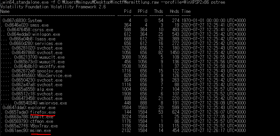 pstree에서 firefox.exe와 msimn.exe가 실행중이었음을 확인할 수 있다.