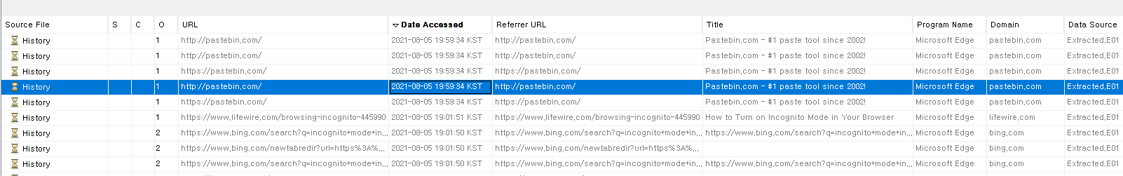 pastebin.com 접속 기록을 확인할 수 있지만 그 이상은 없다. (흔적을 덮기 위해 방문기록을 지웠기 때문.)