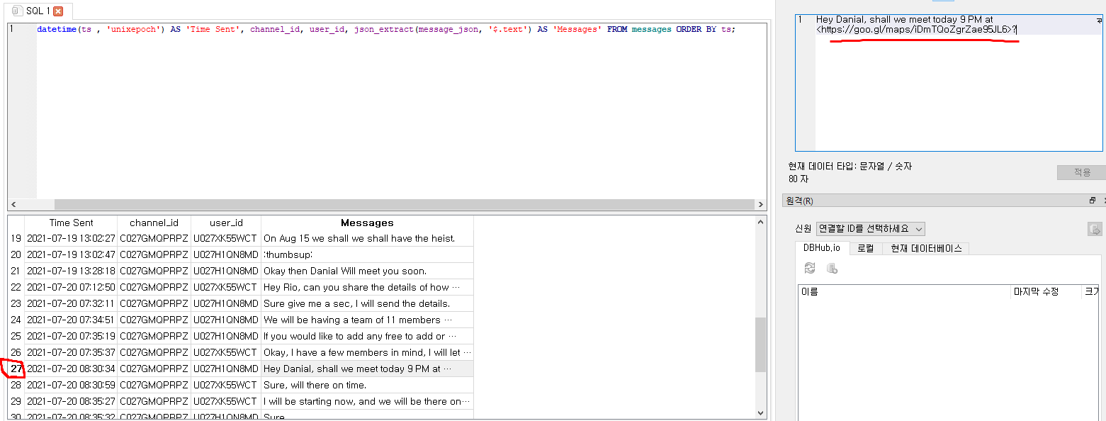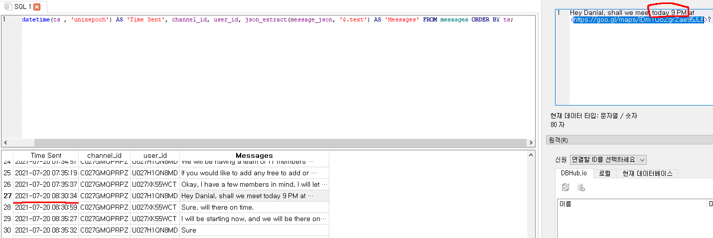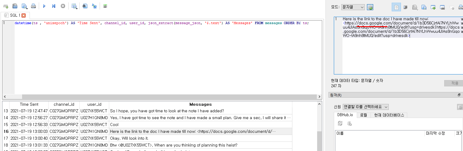 SELECT datetime(ts , 'unixepoch') AS 'Time Sent', channel_id, user_id, json_extract(message_json, '$.text') AS 'Messages' FROM messages ORDER BY ts;